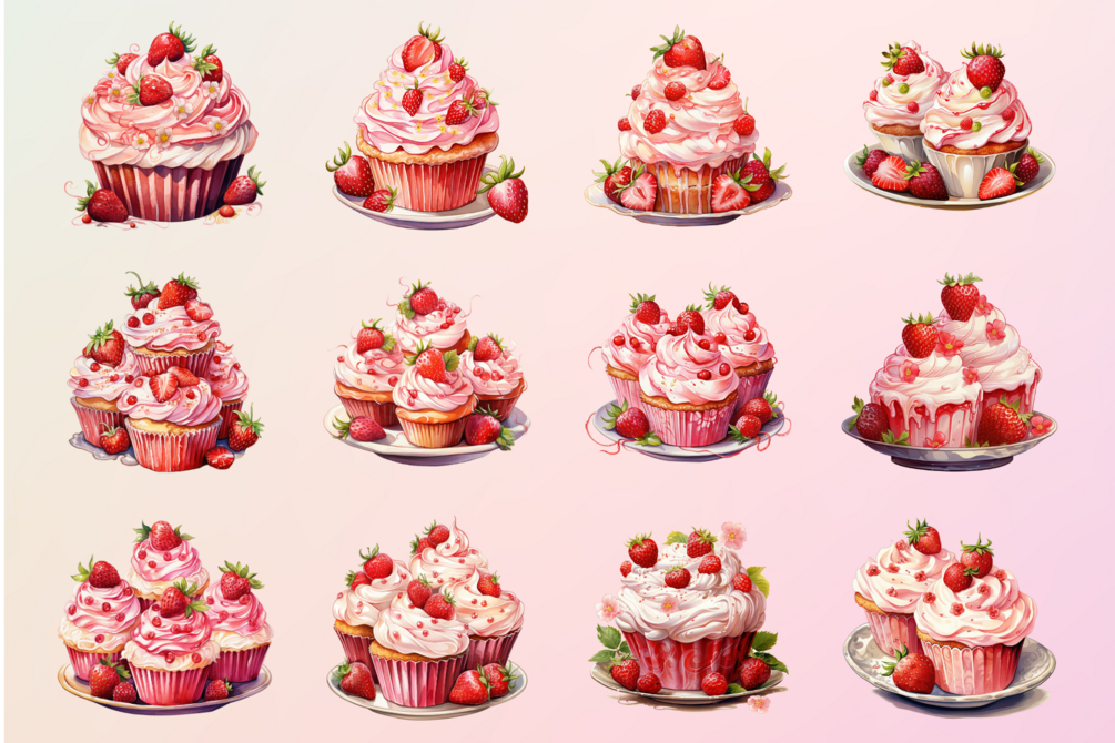 This bundle includes 24 Cupcake Strowberry Valentine Clipart in PNG format with transparent backgrounds, making it easy to add them to your designs without any hassle. The files are high resolution, so you can scale them up or down without losing any quality.